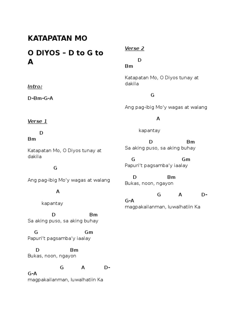 Katapatan Mo O Dios tunay at dakila Ang pag-ibig Moy wagas at walang kapantay Sa aming puso sa aming buhay papurit pagsambay iaalay Bukas noon ngayon magpakailanman luwalhatiin ka. Katapatan Mo O Diyos Verse. Katapatan Mo o Diyos Verse 1 D AC Bm Katapatan Mo O Diyos Tunay at Dakila Em E Asus-A Ang Pag-Ibig Moy Wagas at Walang Kapantay D D7 Sa Aming Puso Sa Aming Buhay G Gm Papurit Pagsambay Iaalay D C Bm DA Em Bukas Noon Ngayon magpakailaman.