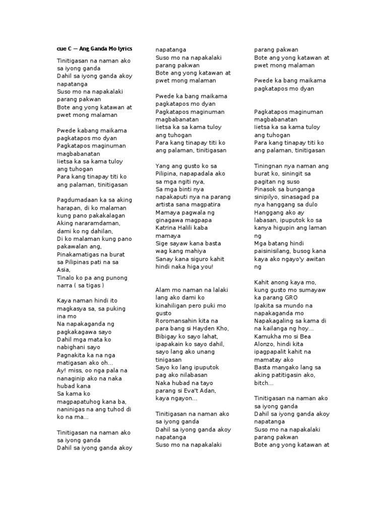 26102017 LyricsGanda Mo Cue C. Tinitigasan na naman ako sa iyong ganda Dahil sa iyong ganda akoy napatanga Suso mo na napakalaki parang pakwan Bote ang yong katawan at pwet mong malaman Pwede kabang. Lyrics by Amiel Edward Morano published on 2012-01-28T082929Z.