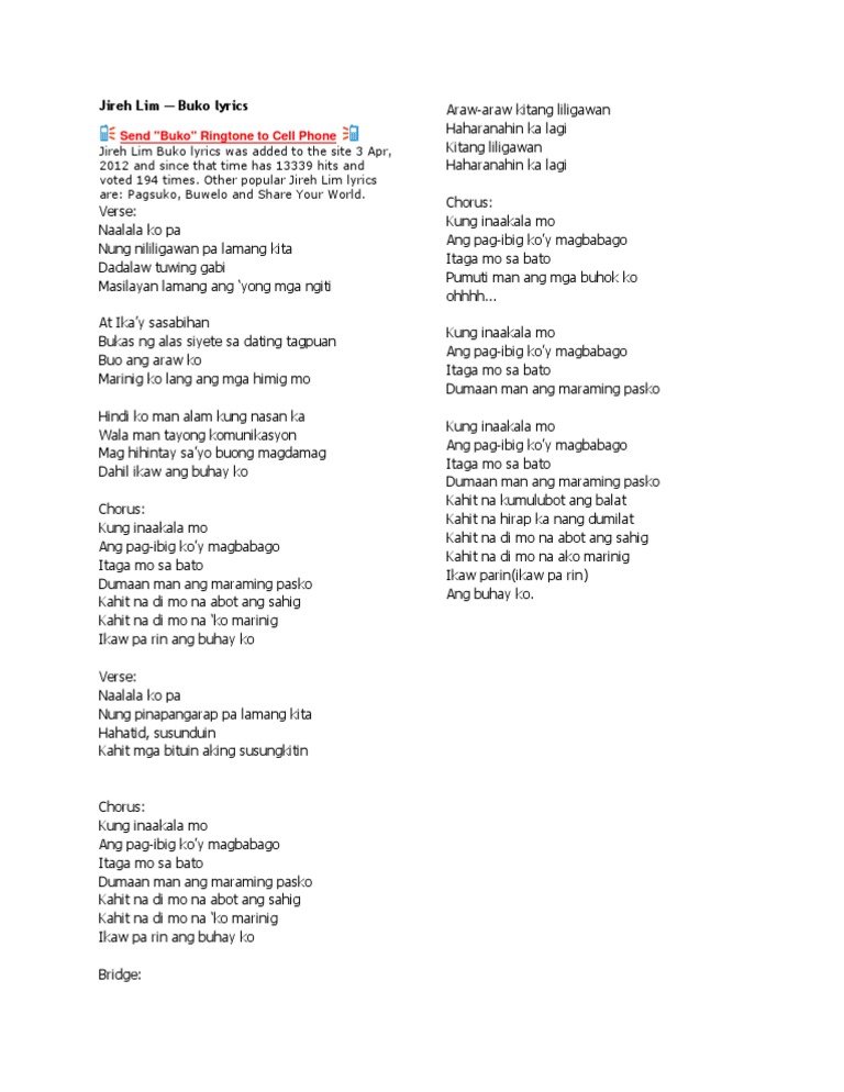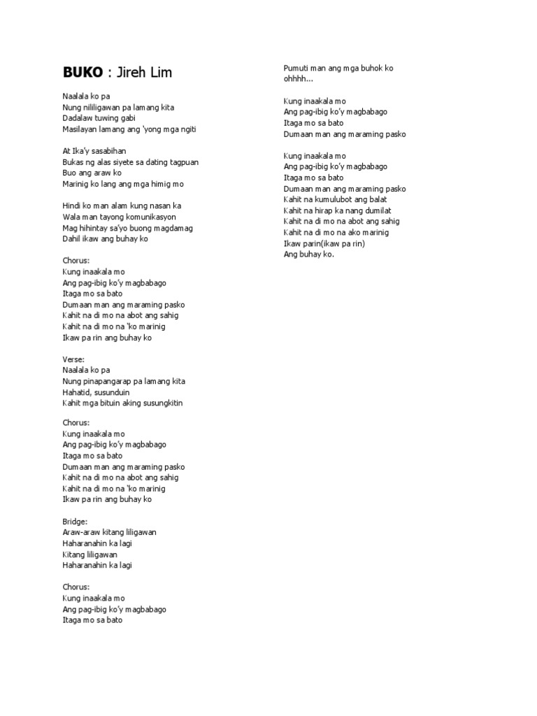 Kung inaakala mo Ang pag-ibig ko y magbabago Itaga. Kung inaakala mo Ang pag-ibig koy magbabago Itaga mo sa bato Dumaan man ang maraming pasko Kahit na kumulubot ang balat Kahit na hirap ka nang dumilat Kahit na di mo na abot ang sahig Kahit na di mo na ako marinig Ikaw parin ikaw pa rin Ang buhay ko. Lim John Jireh S.