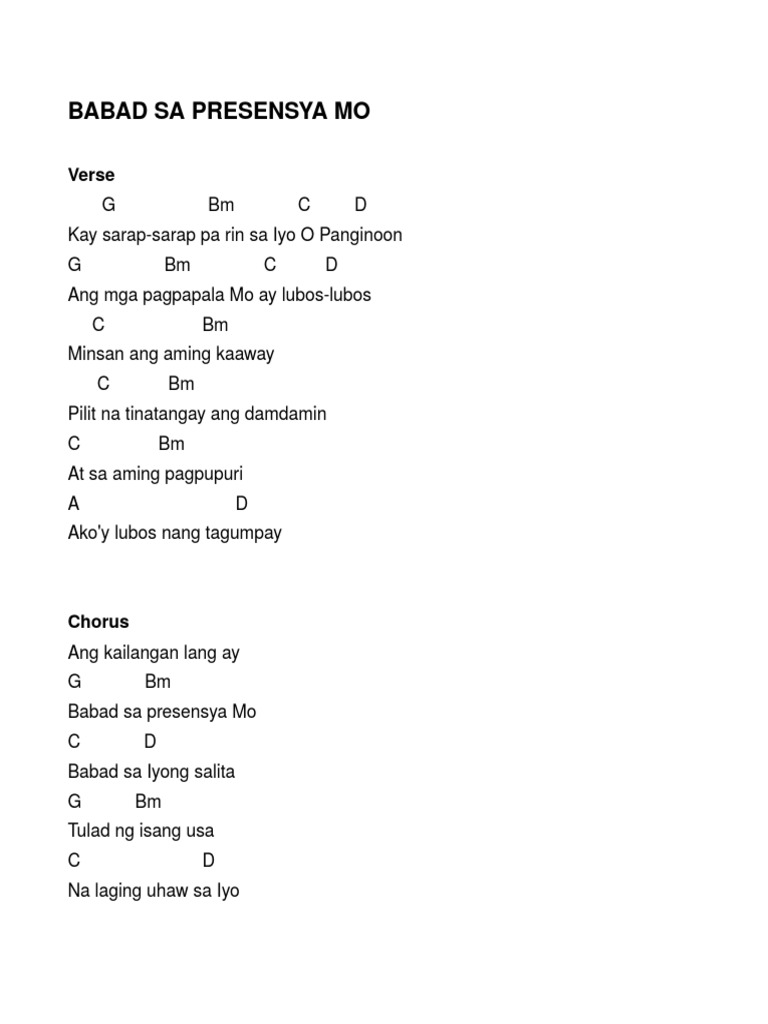 O Panginoon Lyrics and Chords. 24102016 BABAD SA PRESENSYA MO Musikatha Intro G Bm C D Verse G Bm C D Kay sarap-sarap pa rin sa Iyo O Panginoon G Bm C D Ang mga pagpapala Mo ay lubos-lubos Refrain C Bm Minsan ang aming kaaway C Bm Em Pilit na tinatangay ang damdamin C Bm At sa aming pagpupuri Am C Dsus D Akoy lubos nang tagumpay Chorus pause Ang kailangan lang ay G Bm. NA Release Date.